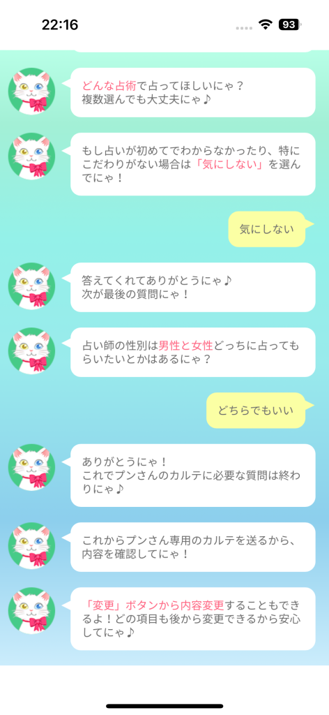 占い師を選んだら、チャット形式で相談内容を入力します。ここでは具体的な悩みを伝えるのがポイント。漠然とした質問よりも「この恋愛、進展する?」など、より具体的に伝えることで、的確なアドバイスをもらえます。